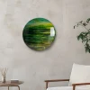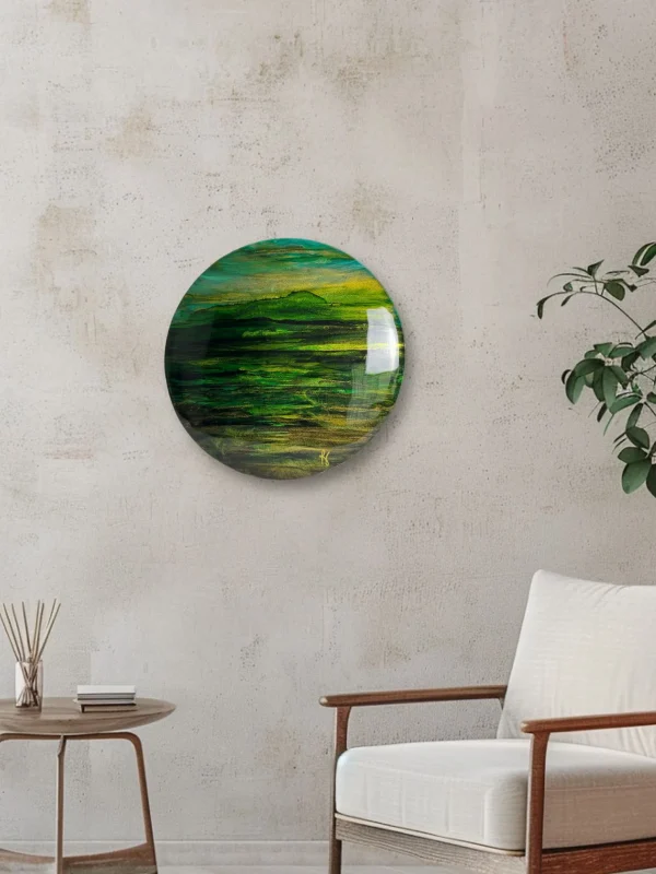 Whispering Meadow is a tribute to the lush green, untouched landscape found in nature. It captures the pastoral panorama, sweeping rich vegetation in jewel like emerald green and suggests a peaceful scenery, regrowth & rejuvenation by nature.