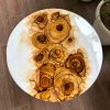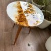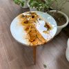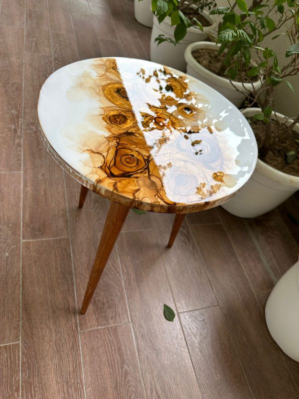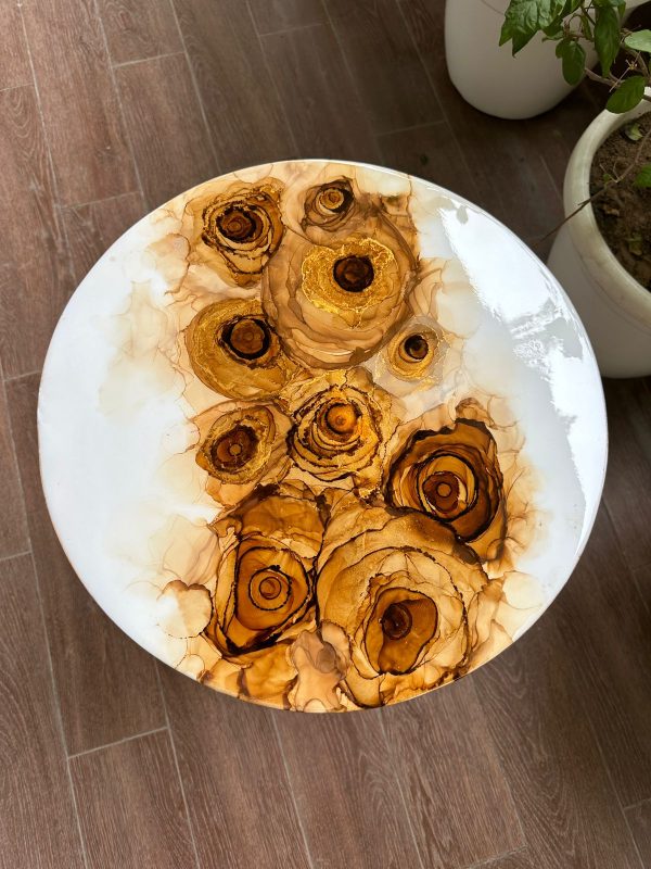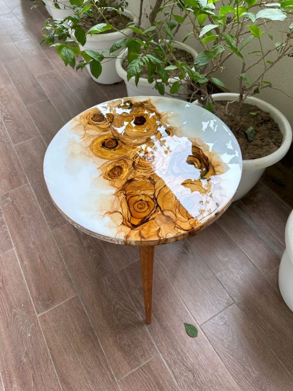 This unique solid wood table has a white epoxy resin finish on the table top with an abstract design of roses created using alcohol ink work. A final epoxy resin coating has been done which lends an unbelievable gloss and is easy to maintain making it durable and very functional. We call it the perfect conversational piece! The stunning wood frame and tripod legs also in natural wood gives it contrast and is elegant!